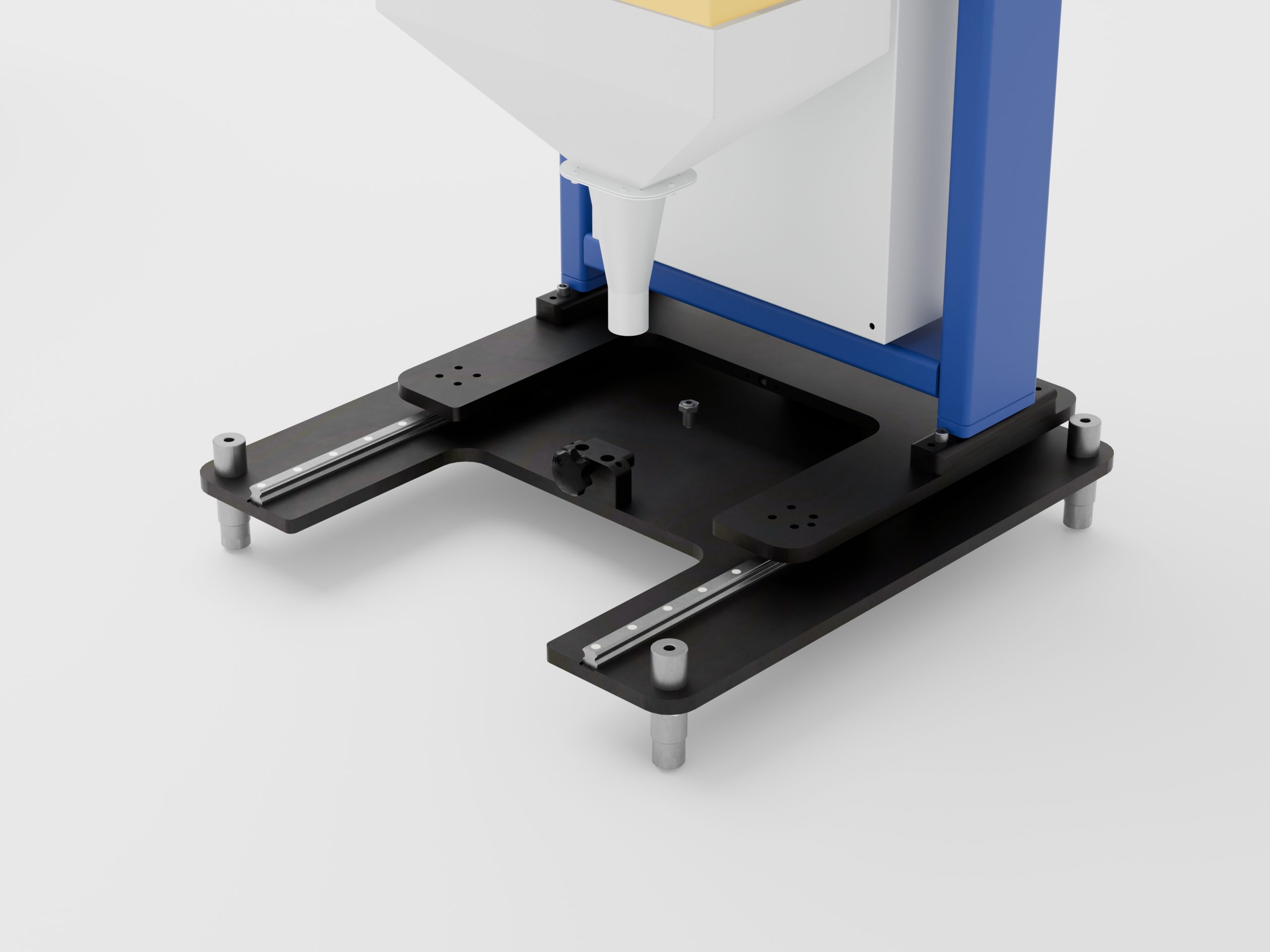 Maschinenuntergestell mit Führungsschlitten. Die Maschine kann so aus der Extrusionslinie geschoben werden.